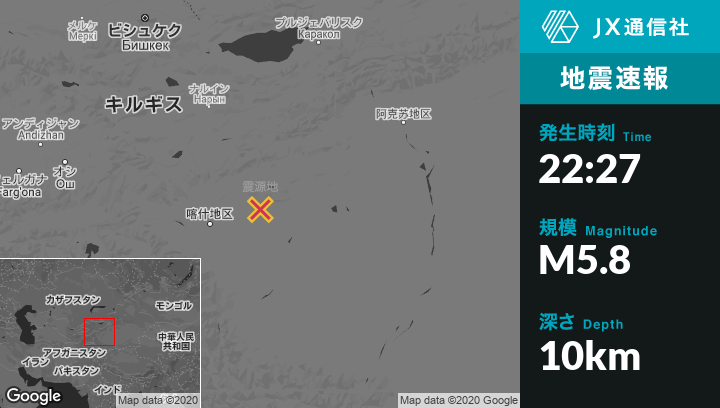 1月19日 22:27頃、中国のArzakから東85kmの地点でM5.8の地震がありました。