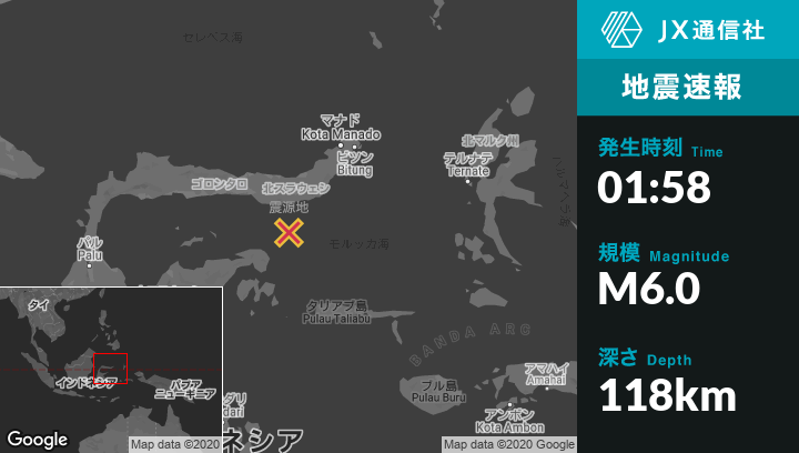 | 震源地 | インドネシアのMolibaguから南南西59kmの地点 |