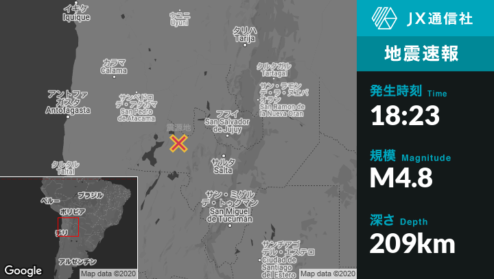 | 震源地 | アルゼンチンのSan Antonio de los Cobresから西56kmの地点 |