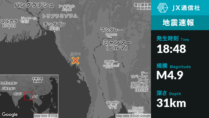 | 震源地 | ミャンマーのAkyabから東北東59kmの地点 |
