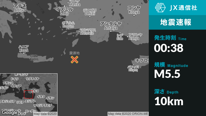 1月29日 00:38頃、ギリシャのKarpathosから東南東70kmの地点でM5.5の地震がありました。