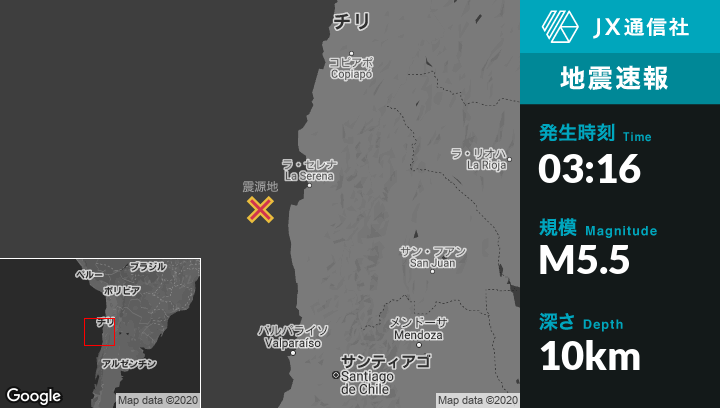 1月29日 03:16頃、チリのCoquimboから西南西102kmの地点でM5.5の地震がありました。