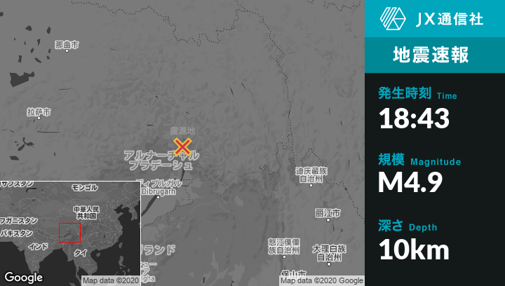 2月01日 18:43頃、中国のMotuoから南東50kmの地点でM4.9の地震がありました。