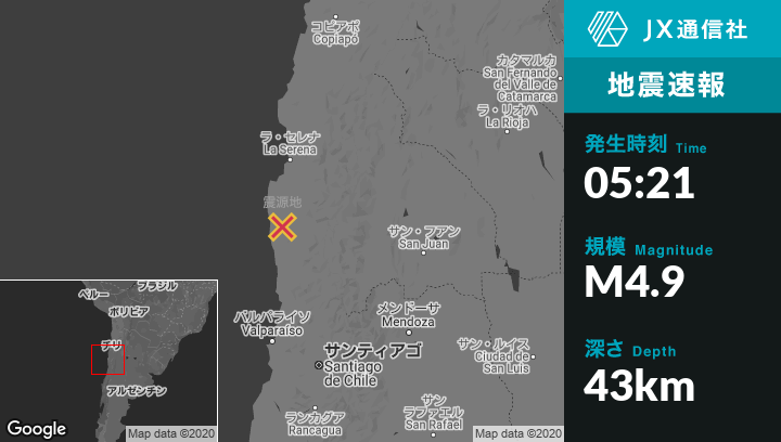 2月27日 05:21頃、チリのOvalleから南南西46kmの地点でM4.9の地震がありました。