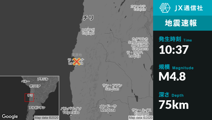 2月27日 10:37頃、チリのLa Serenaから北43kmの地点でM4.8の地震がありました。