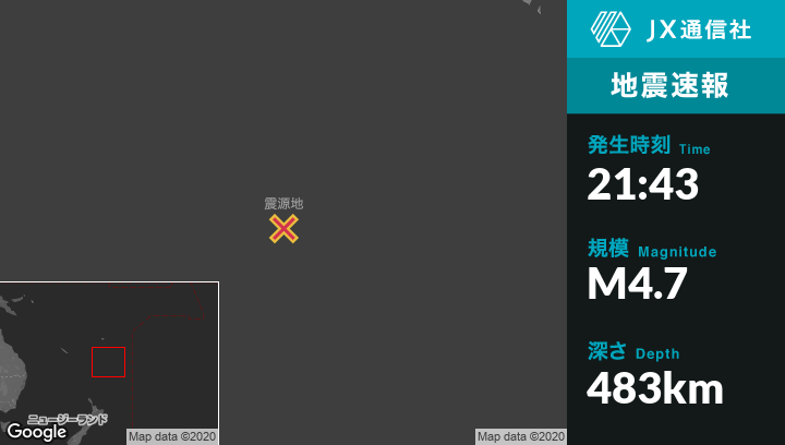 2月27日 21:43頃、ニュージーランドのRaoul Islandから北北西490kmの地点でM4.7の地震がありました。