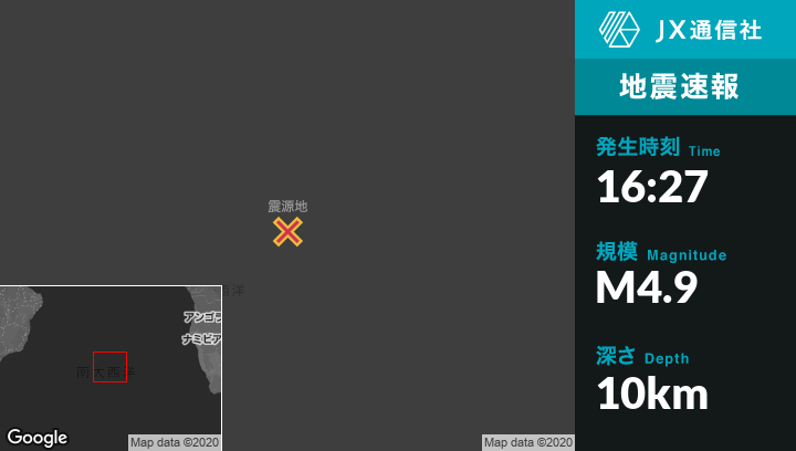 | 震源地 | セントヘレナのEdinburgh of the Seven Seasから北1050kmの地点 |