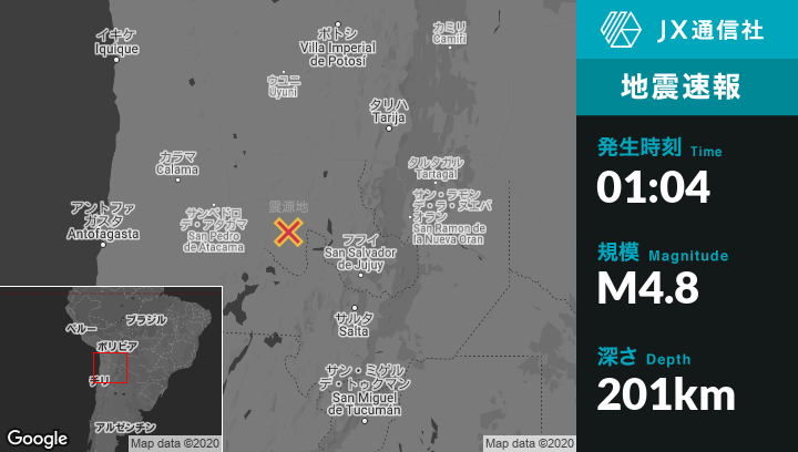4月30日 01:04頃、アルゼンチンのEl Aguilarから西105kmの地点でM4.8の地震がありました。