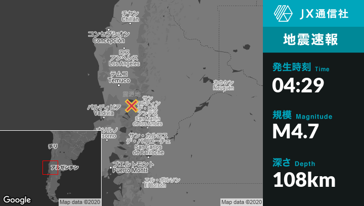 12月30日 04:29頃、チリのPucónから南西10kmの地点でM4.7の地震がありました。