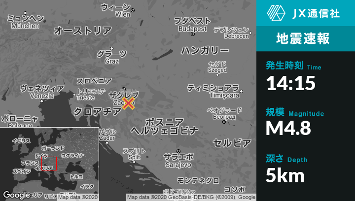 12月30日 14:15頃、クロアチアのPetrinjaから西北西9kmの地点でM4.8の地震がありました。