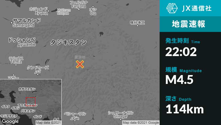 1月02日 22:02頃、タジキスタンのKhorughから東南東30kmの地点でM4.5の地震がありました。