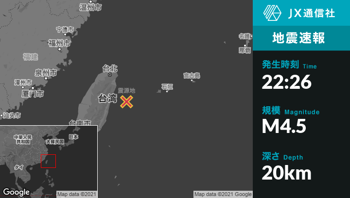 1月02日 22:26頃、台湾のHualien Cityから東72kmの地点でM4.5の地震がありました。