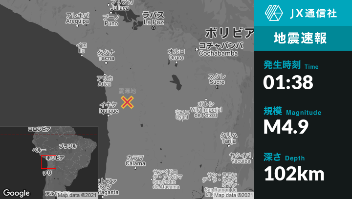1月07日 01:38頃、チリのIquiqueから北東115kmの地点でM4.9の地震がありました。