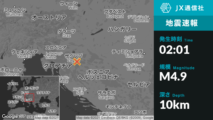 | 震源地 | クロアチアのPetrinjaから西南西6kmの地点 |
