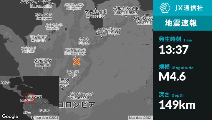 1月07日 13:37頃、コロンビアのCepitáから北西11kmの地点でM4.6の地震がありました。
