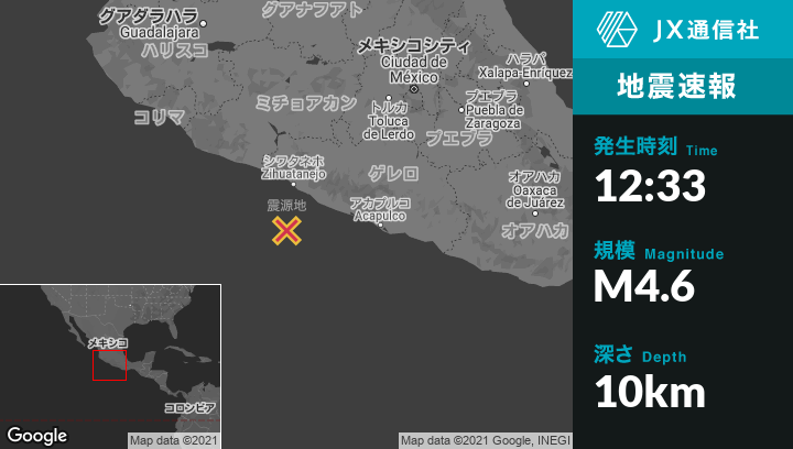 | 震源地 | メキシコのPalos Blancosから南南西85kmの地点 |
