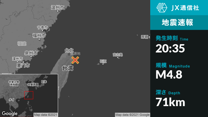 1月09日 20:35頃、台湾のYilanから東28kmの地点でM4.8の地震がありました。