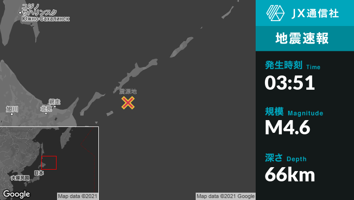 1月29日 03:51頃、ロシアのShikotanから北東81kmの地点でM4.6の地震がありました。