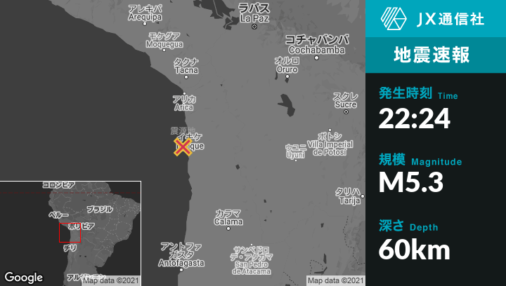 1月30日 22:24頃、チリのIquiqueから北西35kmの地点でM5.3の地震がありました。