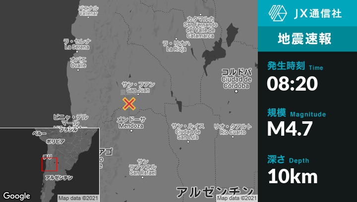 | 震源地 | アルゼンチンのVilla Basilio Nievasから南西32kmの地点 |