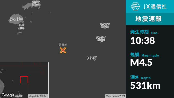 2月03日 10:38頃、トンガのHavelulotoから西北西282kmの地点でM4.5の地震がありました。