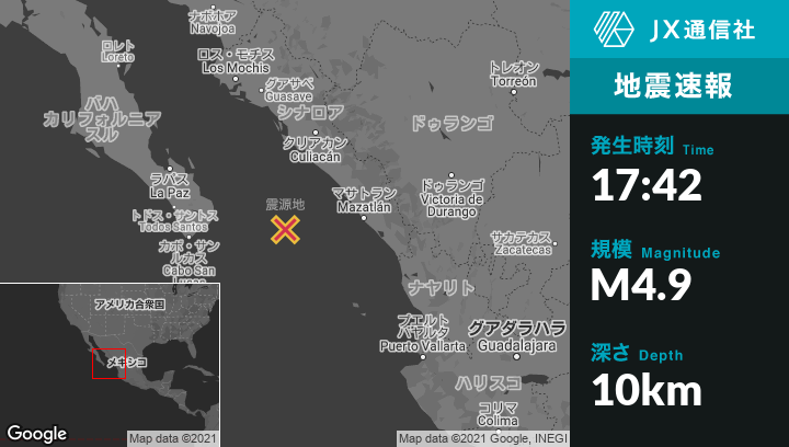 | 震源地 | メキシコのEmpaque Tarribaから南西137kmの地点 |