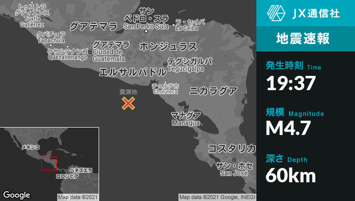 2月03日 19:37頃、エルのPuerto El Triunfoから南南西90kmの地点でM4.7の地震がありました。