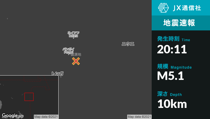 | 震源地 | トンガのPangaiから東南東68kmの地点 |