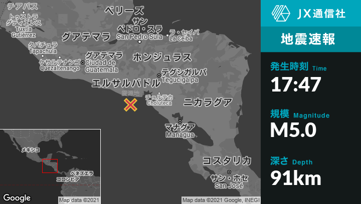 | 震源地 | エルサルバドルのJucuaránから南南西38kmの地点 |