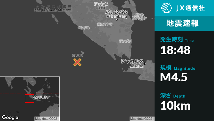 | 震源地 | インドネシアのBengkuluから南245kmの地点 |