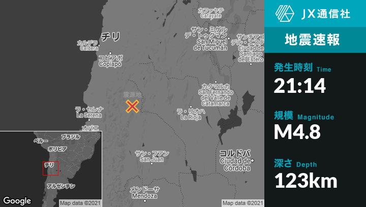 2月17日 21:14頃、アルゼンチンのSan José de Jáchalから北北西122kmの地点でM4.8の地震がありました。