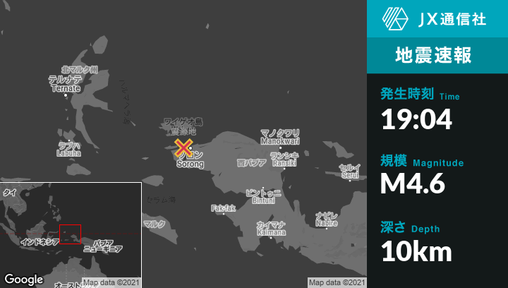 2月20日 19:04頃、インドネシアのSorongから西北西28kmの地点でM4.6の地震がありました。