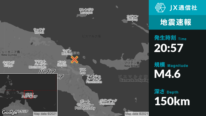 2月20日 20:57頃、パプアニューギニアのMadangから東南東65kmの地点でM4.6の地震がありました。