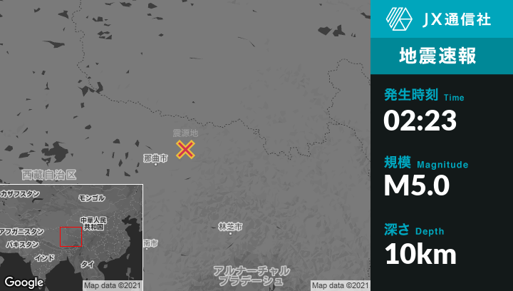 3月23日 02:23頃、中国のNagquから東北東101kmの地点でM5.0の地震がありました。