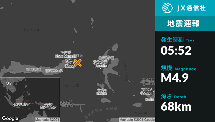 | 震源地 | Laikit II(Dimembe)、インドネシアのLaikitから東南東82kmの地点 |