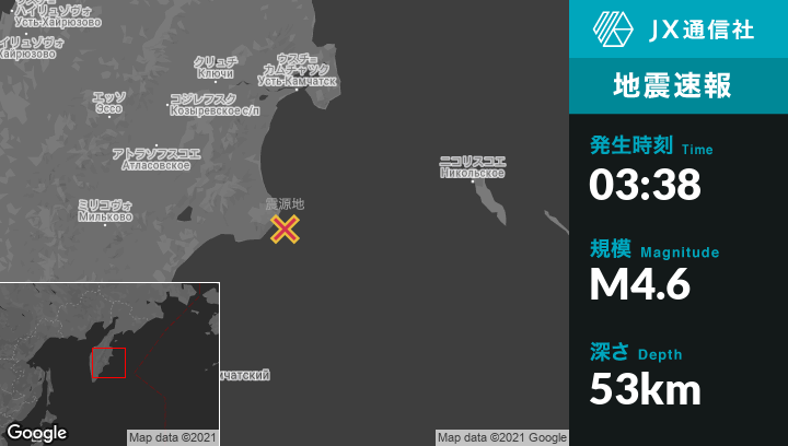 3月29日 03:38頃、ロシアのUst’-Kamchatsk Staryyから南169kmの地点でM4.6の地震がありました。