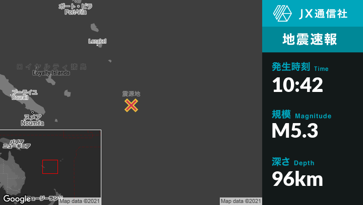 | 震源地 | ニューカレドニアのTadineから東299kmの地点 |