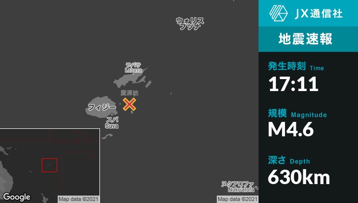 4月05日 17:11頃、フィジーのLevukaから北北西55kmの地点でM4.6の地震がありました。