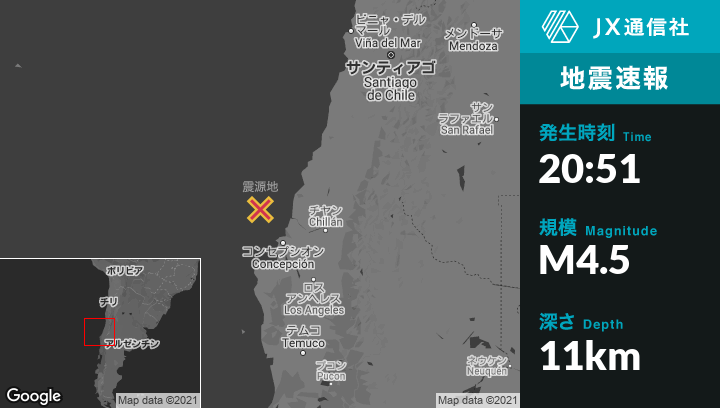 4月05日 20:51頃、チリのToméから北西74kmの地点でM4.5の地震がありました。