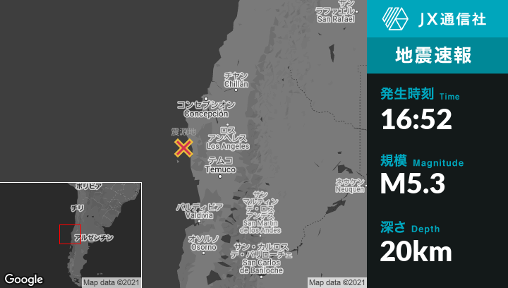 4月10日 16:52頃、チリのCañeteから西南西33kmの地点でM5.3の地震がありました。