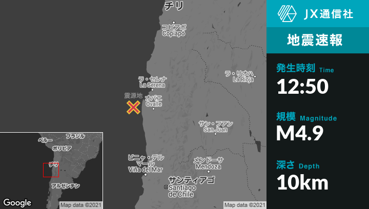 4月17日 12:50頃、チリのOvalleから西85kmの地点でM4.9の地震がありました。