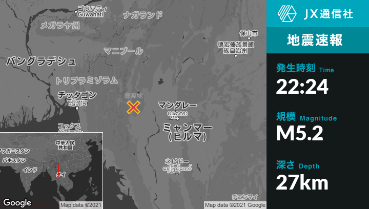 | 震源地 | ミャンマーのHakhaから東南東61kmの地点 |