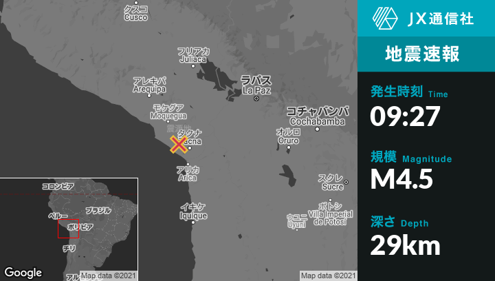 4月19日 09:27頃、ペルーのSama Grandeから西10kmの地点でM4.5の地震がありました。