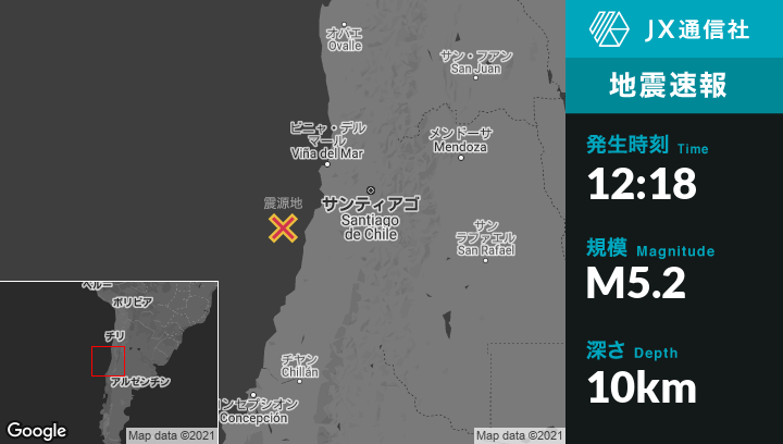 4月19日 12:18頃、チリのSan Antonioから西南西87kmの地点でM5.2の地震がありました。