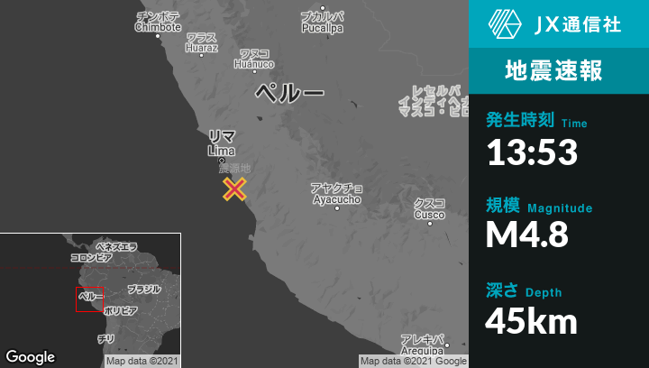4月20日 13:53頃、ペルーのChilcaから南8kmの地点でM4.8の地震がありました。