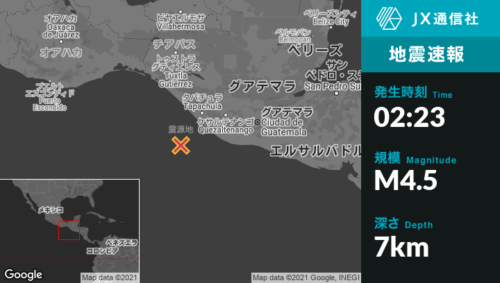 4月21日 02:23頃、メキシコのPuerto Maderoから南西93kmの地点でM4.5の地震がありました。