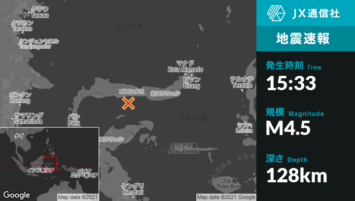 | 震源地 | インドネシアのGorontaloから西南西88kmの地点 |