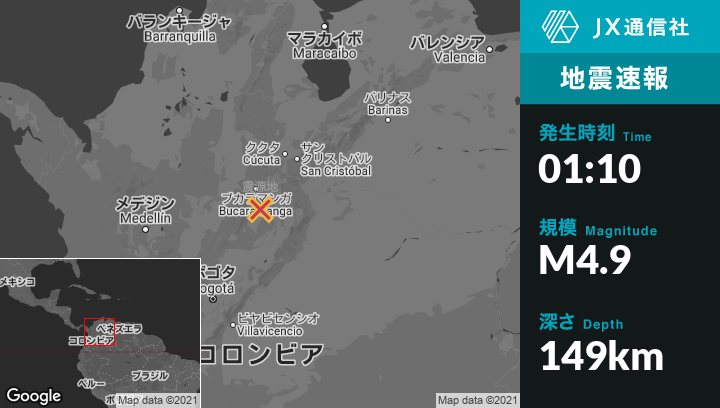 5月29日 01:10頃、コロンビアのCepitáから北西8kmの地点でM4.9の地震がありました。