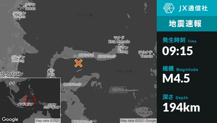 | 震源地 | インドネシアのGorontaloから西南西135kmの地点 |