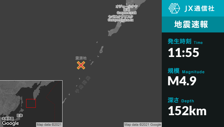 5月31日 11:55頃、ロシアのSevero-Kuril’skから南西291kmの地点でM4.9の地震がありました。